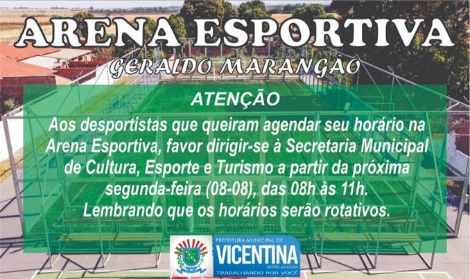 Regiaonline Aviso: Prefeitura Municipal de Vicentina-MS emite comunicado aos desportistas que queiram utilizar a Arena Esportiva.