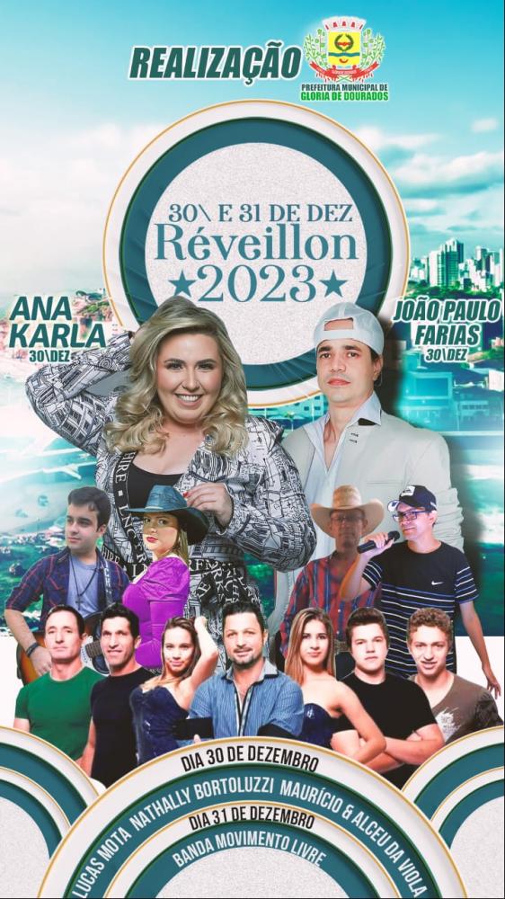 Regiaonline Réveillon 2023: Glória de Dourados terá shows com Ana Karla, João Paulo Farias, Maurício Óliver e Alceu da Viola, Lucas Mota, Nathally Bortoluzzi e Banda Movimento Livre.