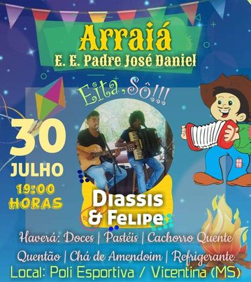 Regiaonline Cultural: Em Vicentina-MS, Arraiá da E.E. Padre José Daniel terá música com Di Assis e Felipe.