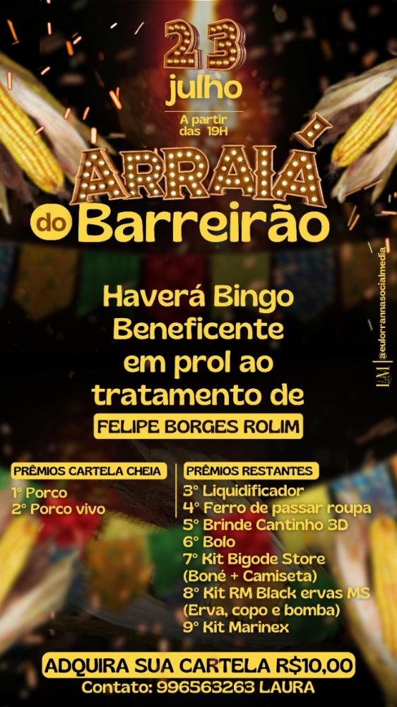 Regiaonline Beneficente: Arraiá do Barreirão terá Bingo Beneficente em Prol de Felipe Borges Rolim.