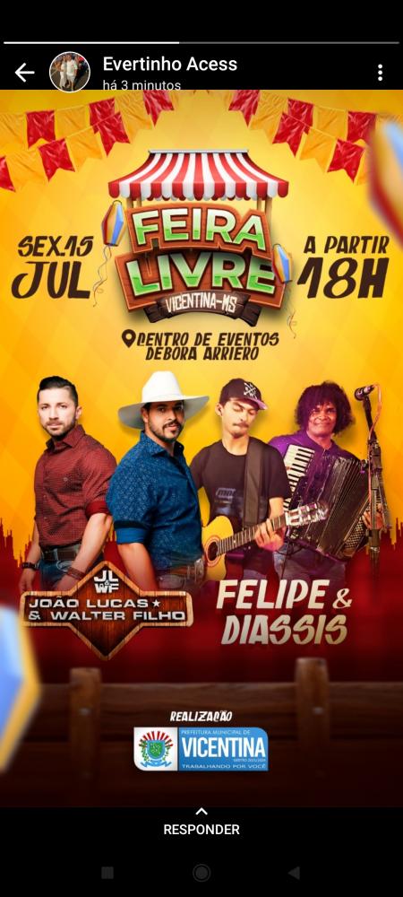 Regiaonline Evento :Em Vicentina, musical com João Lucas e Walter Filho e Felipe e Di Assis marcam o Retorno da Feira Livre.