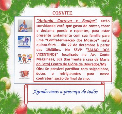 Confraternização dos músicos acontece hoje no salão dos vicentinos em Gloria de Dourados