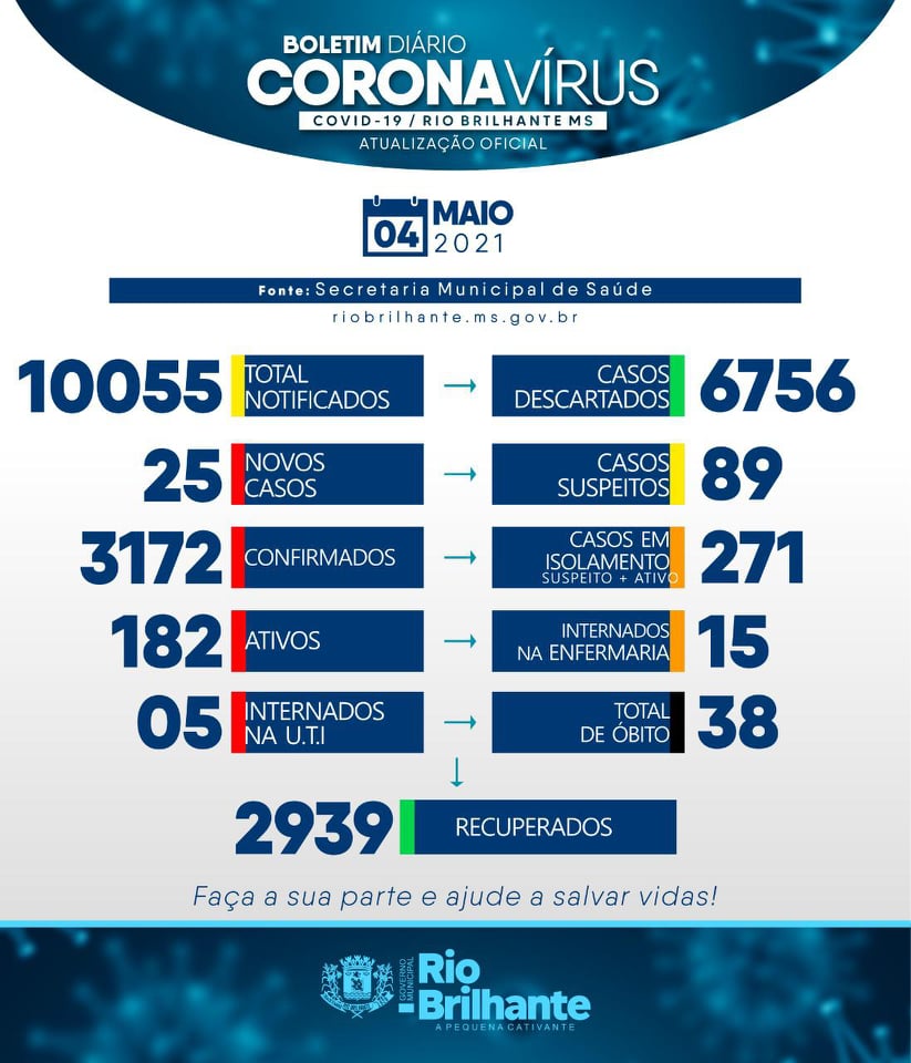 Regiaonline Plantão Coronavírus: Com 25 novos casos, 182 ativos e 89 suspeitos, Rio Brilhante divulga atualização desta terça-feira.
