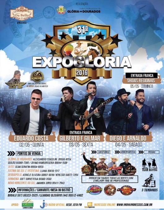 Com portões abertos todos os dias começa na quinta-feira (02) Maio a 31ª edição da Expoglória (Exposição Agropecuária e Industrial de Glória de Dourados). Para quem procura opções de entretenimento, a exposição é uma ótima oportunidade para sair da rotina e curtir grandes Shows. Este ano a feira terá quatro dias de festa, se estendendo até o dia 05 de maio. A programação oficial durante os qautro dias de exposição, festa que anuncia o 56º aniversário de independência política administrativo do município de Glória de Dourados dispõe do seguinte calendário: