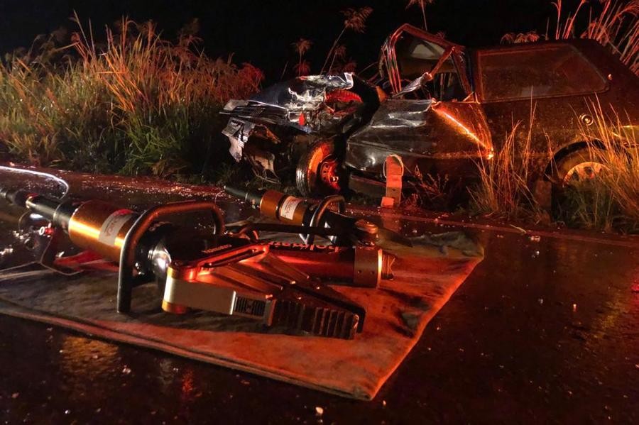 Com o impacto do choque, o condutor do Fiat Uno morreu no local e uma mulher que também ocupava o veículo, ficou presa às ferragens.