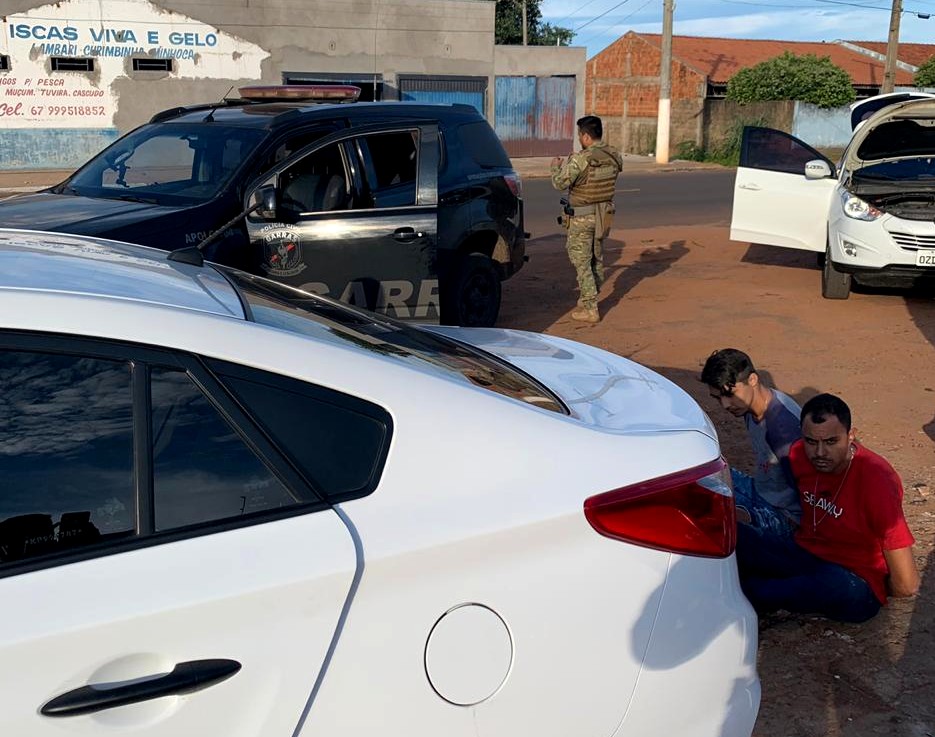 CAMPO GRANDE (MS) - Na tarde do último dia (15), uma equipe da Delegacia Especializada de Repressão a Roubos a Banco, Assaltos e Sequestros - GARRAS, prendeu em flagrante, em uma borracharia de Anastácio (MS), Ramon Rodrigues de Figueiredo(27) e Alexandre de Azevedo Monteiro(30) e sua namorada Maria Eduarda de Souza Silva(19). Com os autores, a Polícia Civil recuperou um veículo IX35 e um HB20S. O