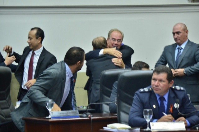 Idenor abraça o colega Bebeto, que votou contra a cassação de mandato (Foto: Eliel Oliveira)