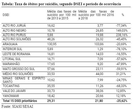 Além, disso, em 2015, foi criada uma linha de cuidado para prevenção do suicídio para os DSEIs identificados com maiores taxas de suicídios, cuja estratégia visa oferecer suporte e apoio às famílias e grupos com proximidade à vítima de um evento, bem como acompanhamento de indivíduos identificados como vulneráveis