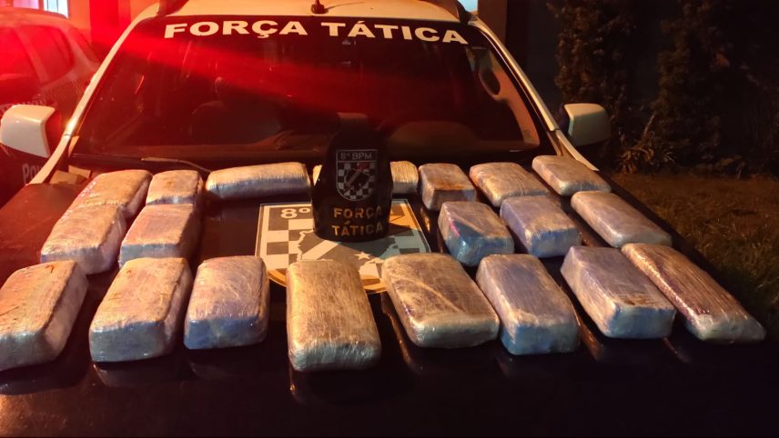 Nova Andradina (MS) – O 8º Batalhão de Nova Andradina, “Guardião do Vale do Ivinhema”, através da equipe de Força Tática prendeu no início da noite de ontem (10/12) um homem de 39 anos de idade com mais de 22 Kg de drogas em um veículo VW Gol com placas de Ponta Porã-MS.