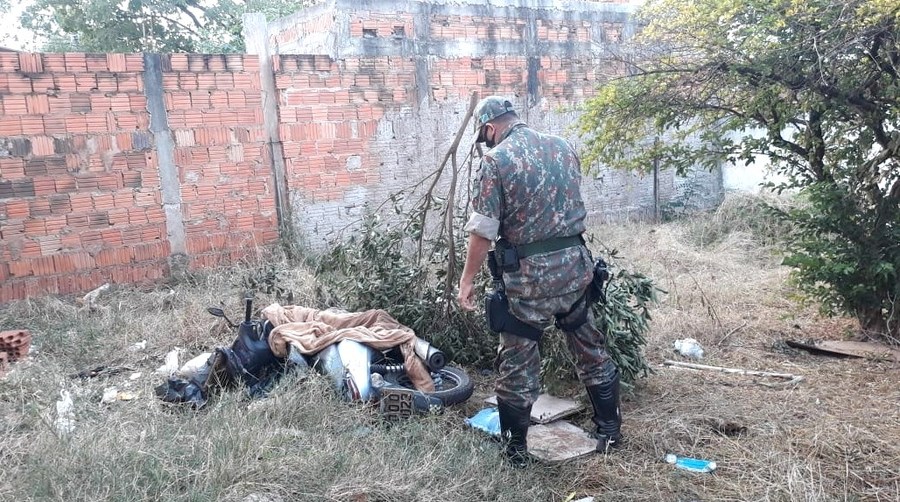 Mulher tem moto furtada ao ir à manicure, e em menos de 1h, é recuperada coberta com galhadas em um terreno baldio