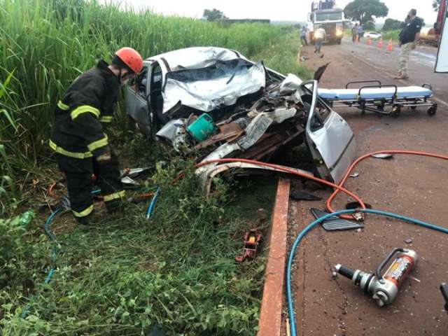 Carro fica destruído após acidente com caminhão pipa e carreta