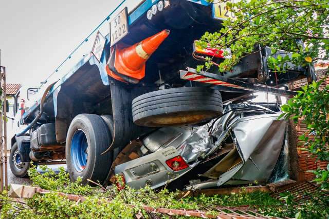 Caminhão carregado com combustível perde o freio, prensa carro e “sobe” em muro