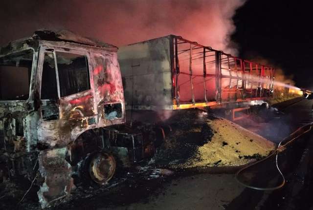 Carreta carregada com soja fica destruída após pegar fogo em Nova Andradina
