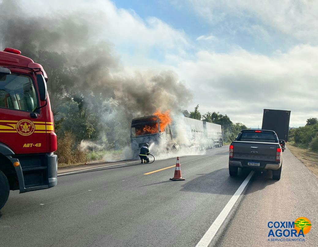 Carreta fica parcialmente destruída após pegar fogo na BR-163 em MS