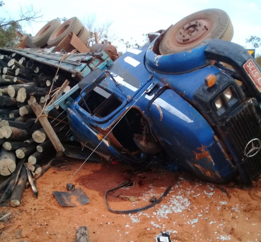 Caminhão carregado de lenha tomba em estrada rural na Vila Alice em Ivinhema