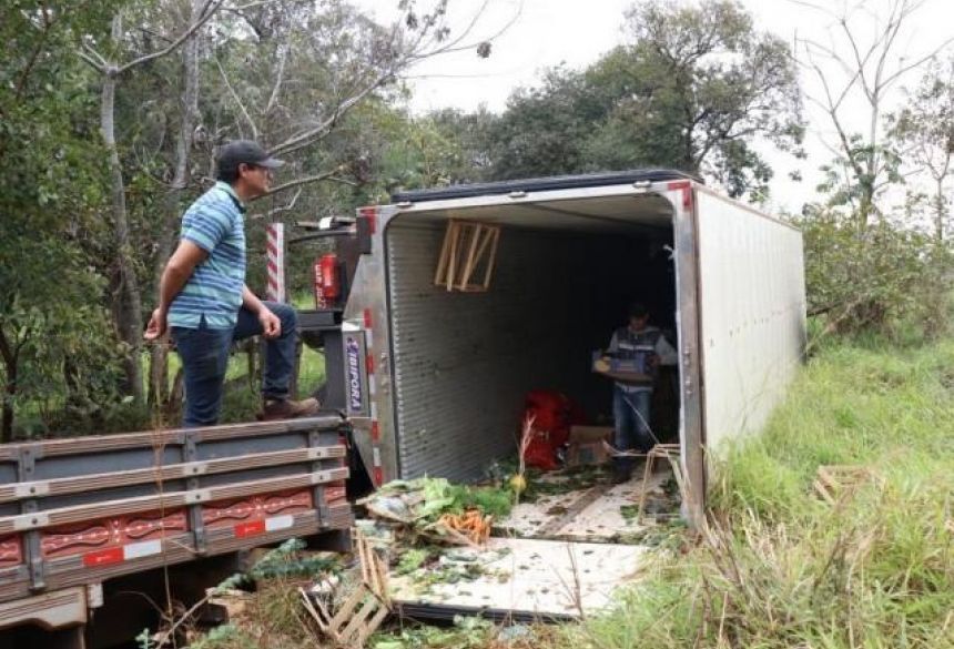 Motorista desvia de capivara e tomba caminhão carregado de frutas e verduras