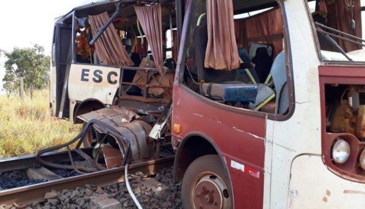 Ônibus escolar estraga em cima de linha férrea e é atingido por trem em MS