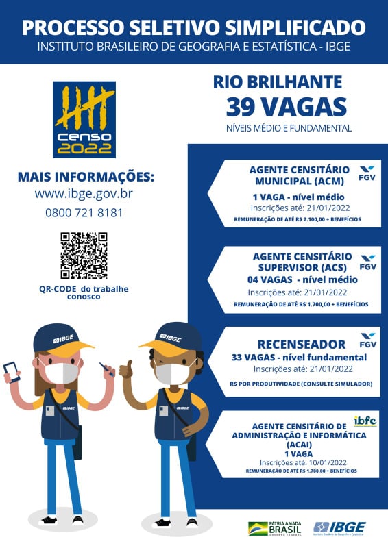 BGE prorroga até 21 de janeiro as inscrições para mais de 2.800 vagas em MS do Censo 2022, confira as 39 vagas disponíveis para Rio Brilhante