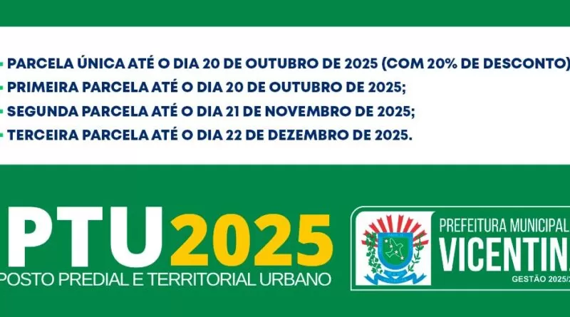 Fique em dia com Vicentina: Prefeitura lança o IPTU 2025 para quitação à vista com desconto ou parcelado