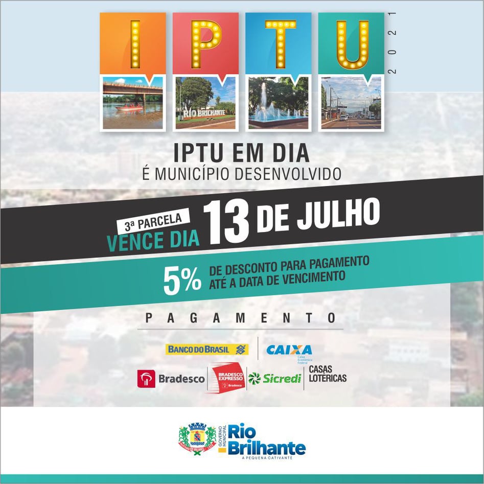 Regiaonline IPTU 2021: Em Rio Brilhante, 3ª Parcela vence 13 de julho.