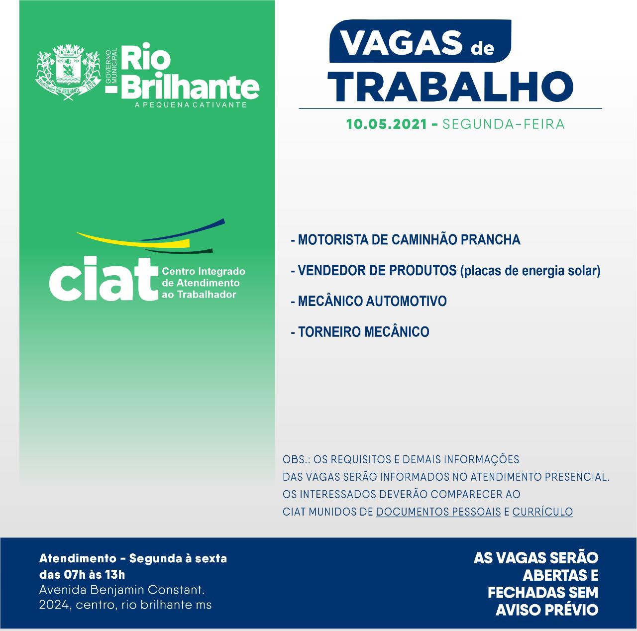 Regiaonline Oportunidades de Emprego: CIAT divulga vagas de trabalho em Rio Brilhante.