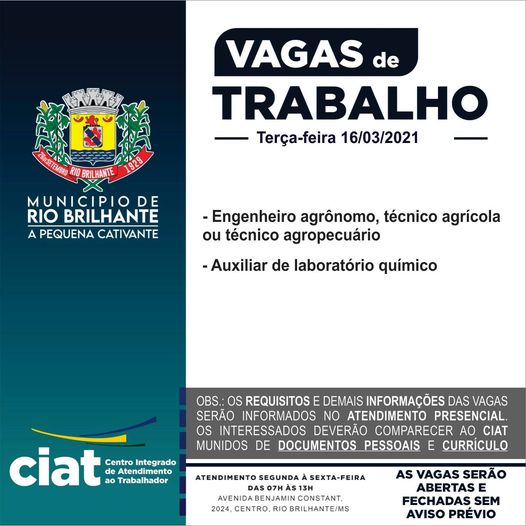 Regiaonline Vagas de Emprego: Prefeitura de Rio Brilhante divulga oportunidade de trabalho pelo (CIAT)