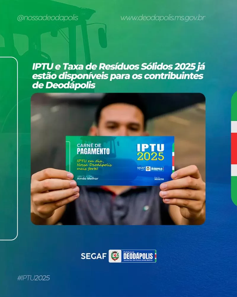 IPTU e Taxa de Resíduos Sólidos 2025 já estão disponíveis para os contribuintes de Deodápolis