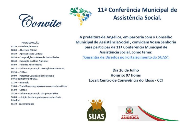 A prefeitura Municipal de Angélica convida a todos para participar da 11ª Conferência Municipal de Assistência Social