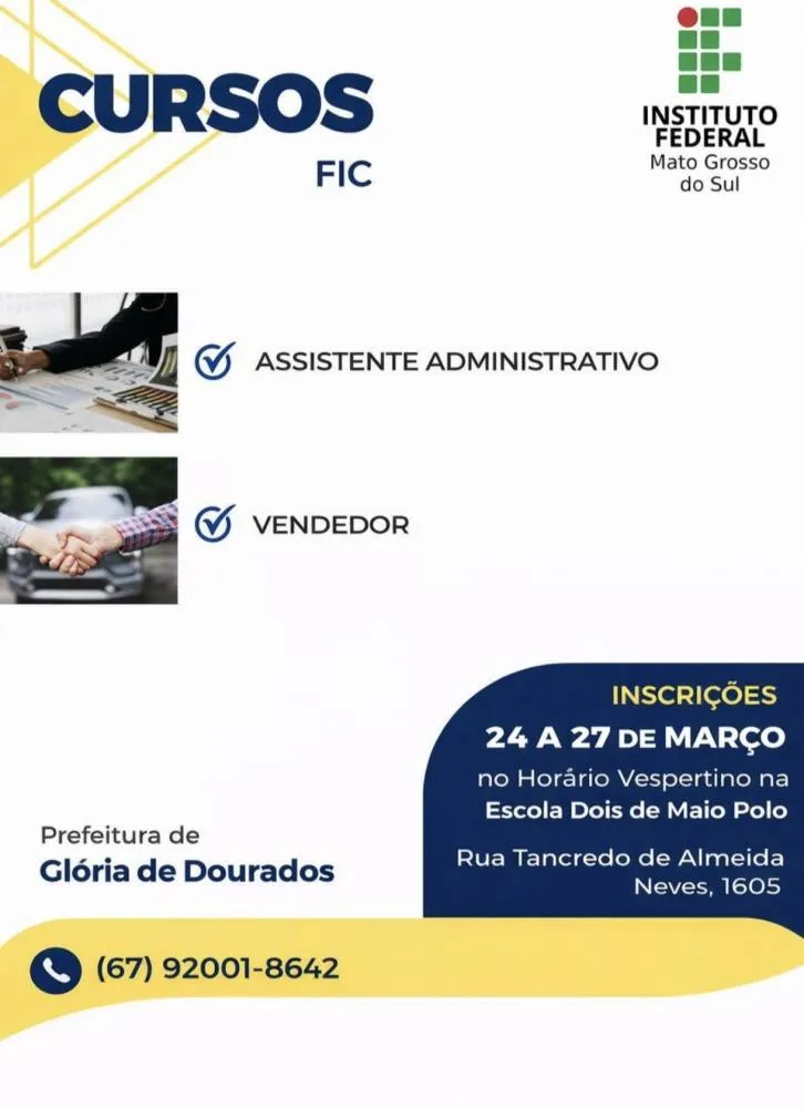 Prefeitura de Glória de Dourados e IFMS abrem inscrições para cursos gratuitos e on-line