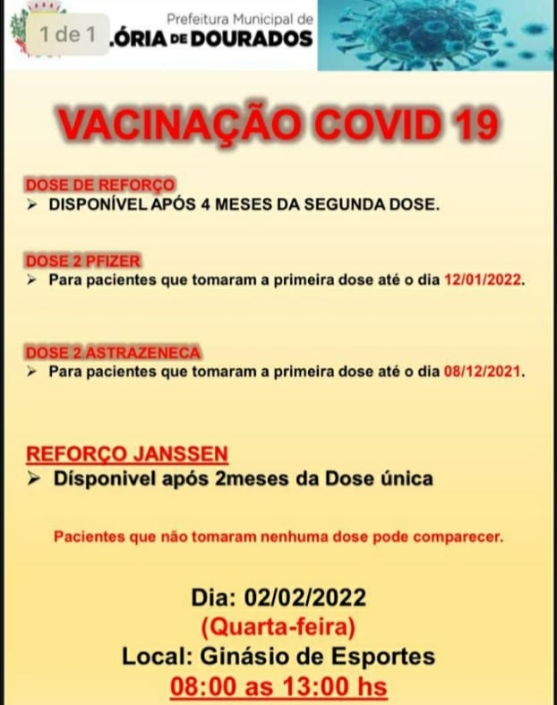 Regiaonline Imunização Covid-19: Quarta-feira é dia de Vacinação em Glória de Dourados.