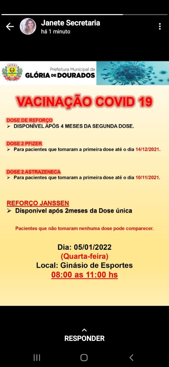 Regiaonline Saúde: Nesta quarta-feira é dia de Vacinação Covid-19 em Glória de Dourados.