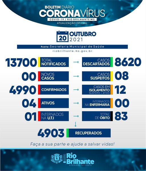 Uma notícia que enche o coração de esperança: Rio Brilhante nesta Quarta-feira (20) não registrou nenhum caso positivo.