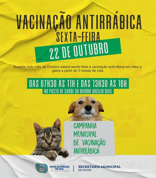 Nova Alvorada do Sul: Nesta sexta-feira (22), terá vacinação Antirrábica no Bairro Vacilio Dias