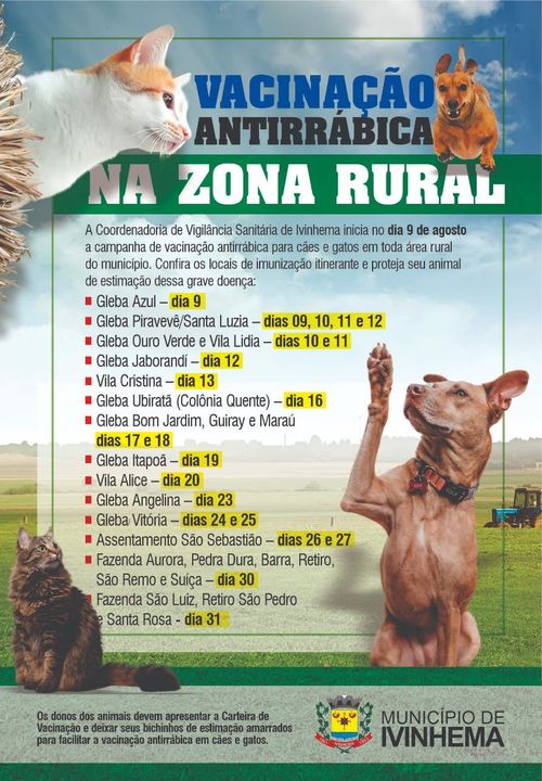 Regiaonline Vigilância Sanitária: Em Ivinhema, campanha de vacinação de cães e gatos contra a raiva se inicia na Zona Rural, a partir do Dia 09 de agosto.