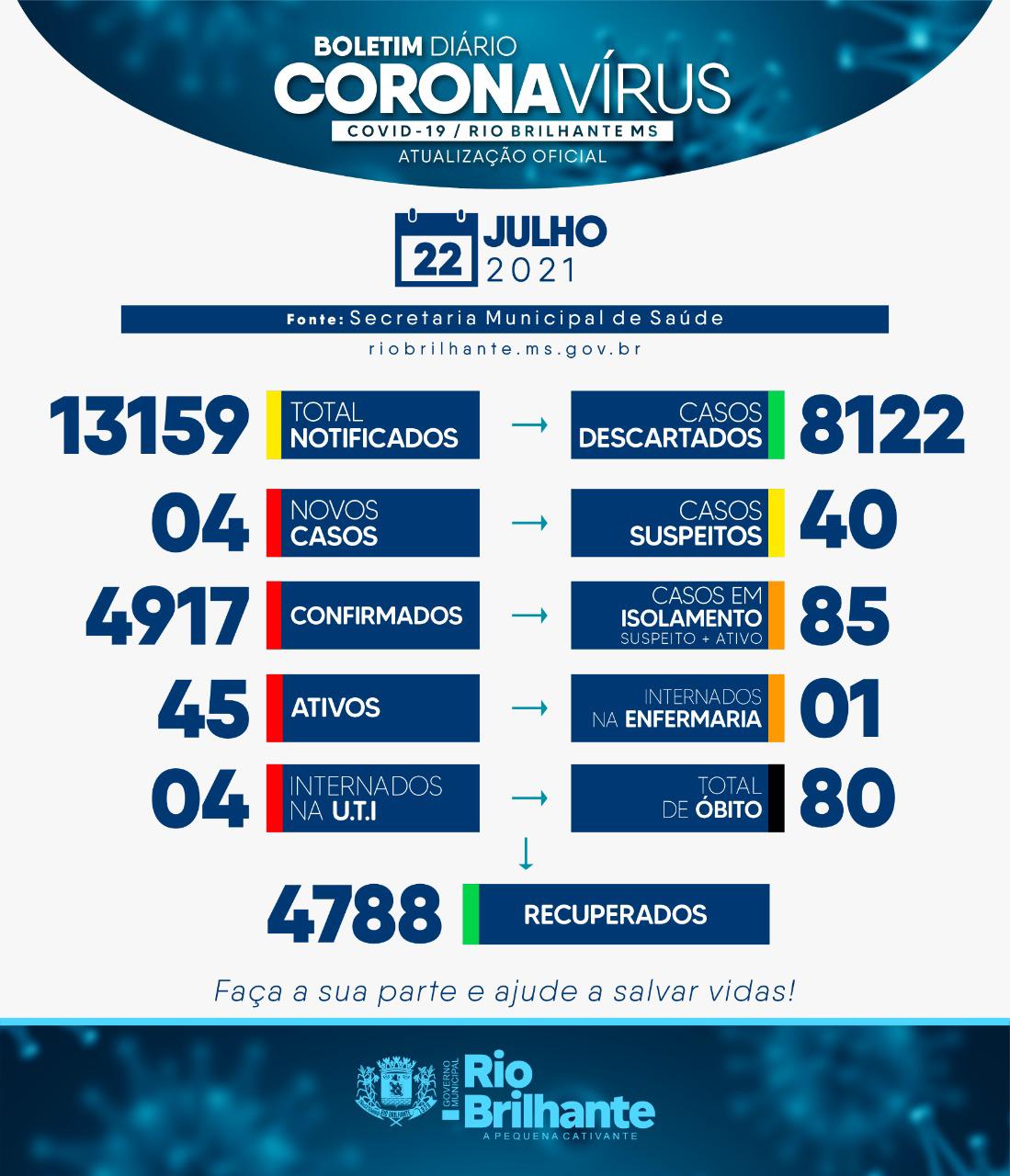Regiaonline Plantão Coronavírus: Em Rio Brilhante, 04 novos casos e 45 ativos nesta quinta-feira.