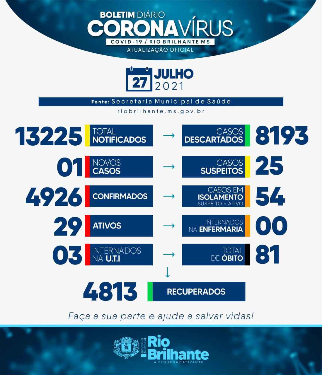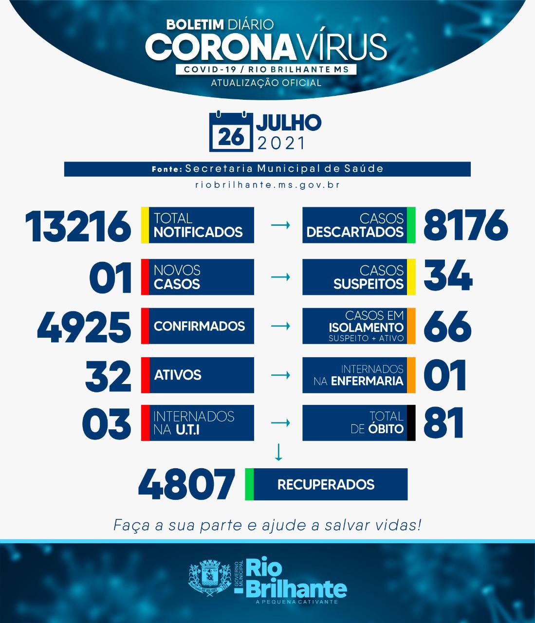 Regiaonline Plantão Coronavírus: Rio Brilhante tem 00 internados na enfermaria e 01 novo caso nesta terça-feira.