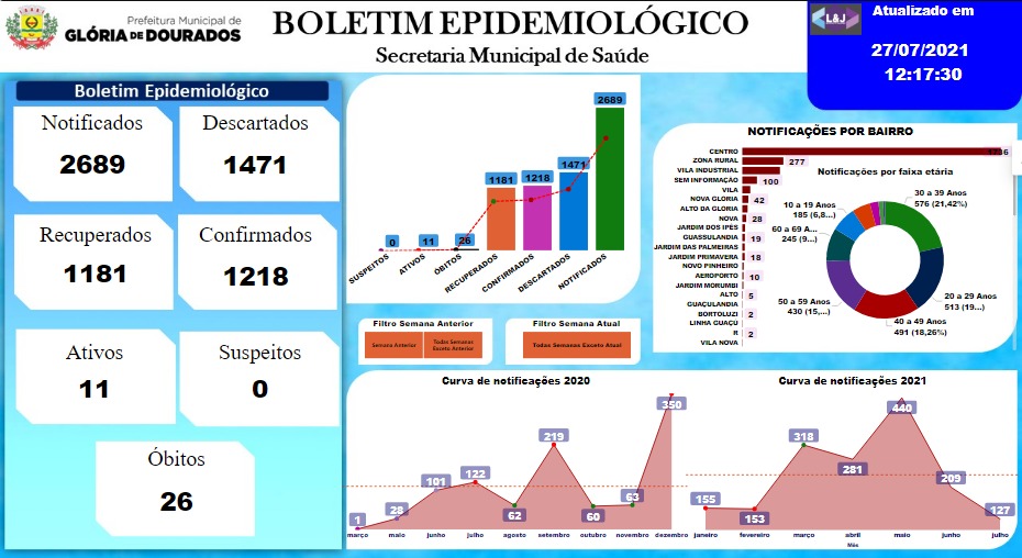 Regiaonline Coronavírus: Glória de Dourados tem 11 ativos e 00 suspeitos nesta terça-feira.
