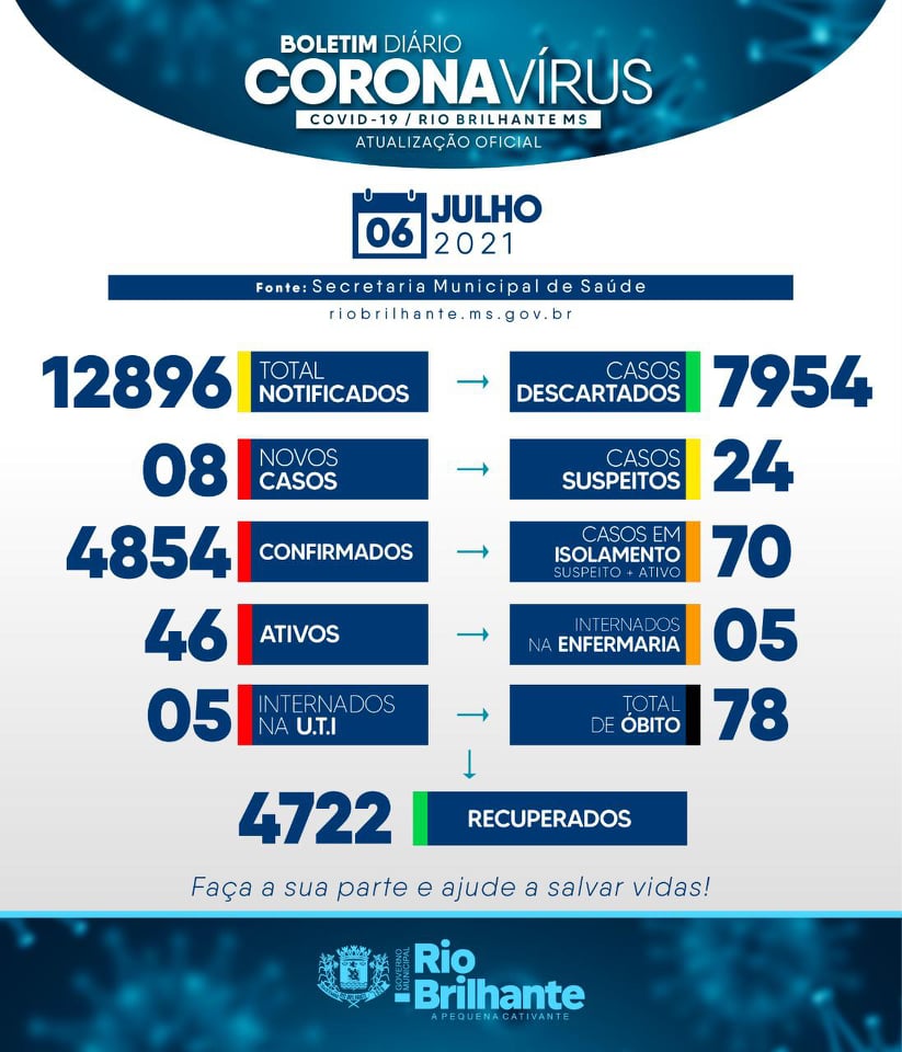 Regiaonline Plantão Coronavírus: Rio Brilhante tem 08 novos casos e 46 ativos nesta terça-feira.