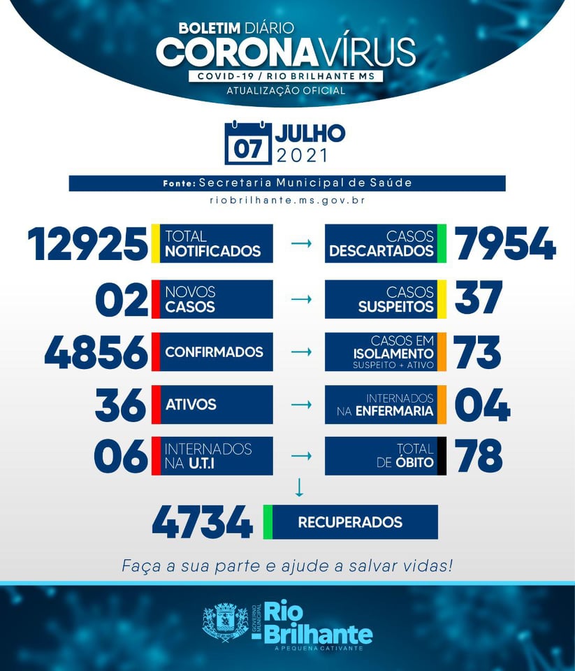 Regiaonline Plantão Coronavirus: Rio Brilhante tem 02 novos casos e 36 ativos nesta quarta-feira.