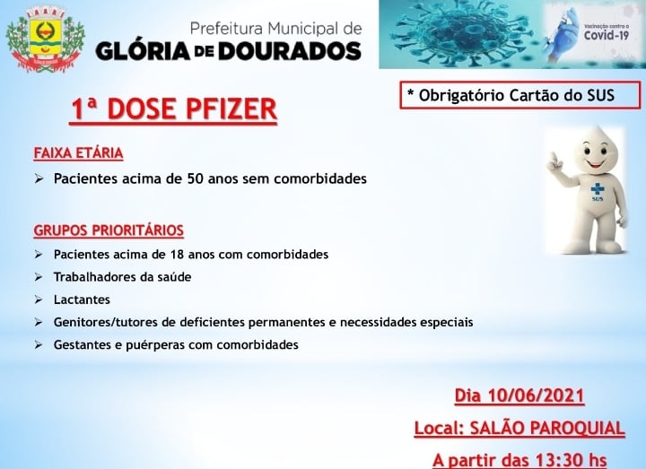 Regiaonline Imunização: Em Glória de Dourados, 1a dose da Vacina Pfizer contra Covid-19 será aplicada nesta sexta-feira.
