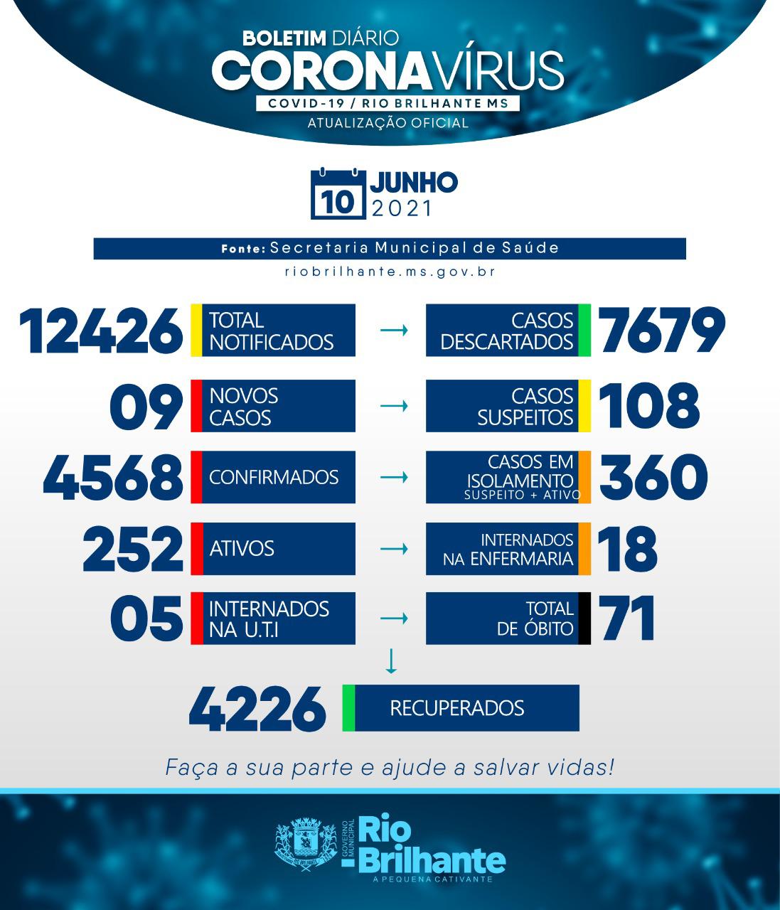 Regiaonline Coronavírus: Com 252 ativos, Rio Brilhante registra 09 novos casos nesta quinta-feira.