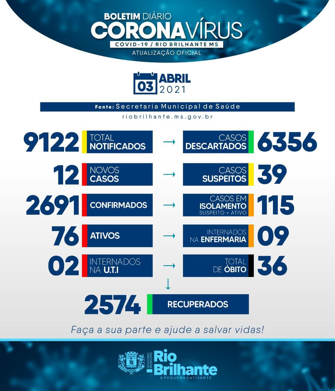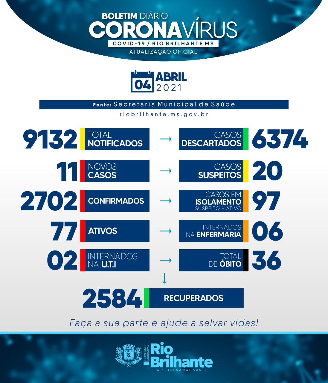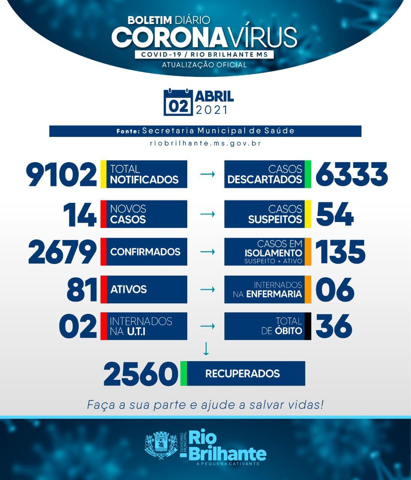 Regiaonline Boletim Epidemiológico Covid-19: Em Rio Brilhante, 12 novos casos e 76 ativos no sábado.