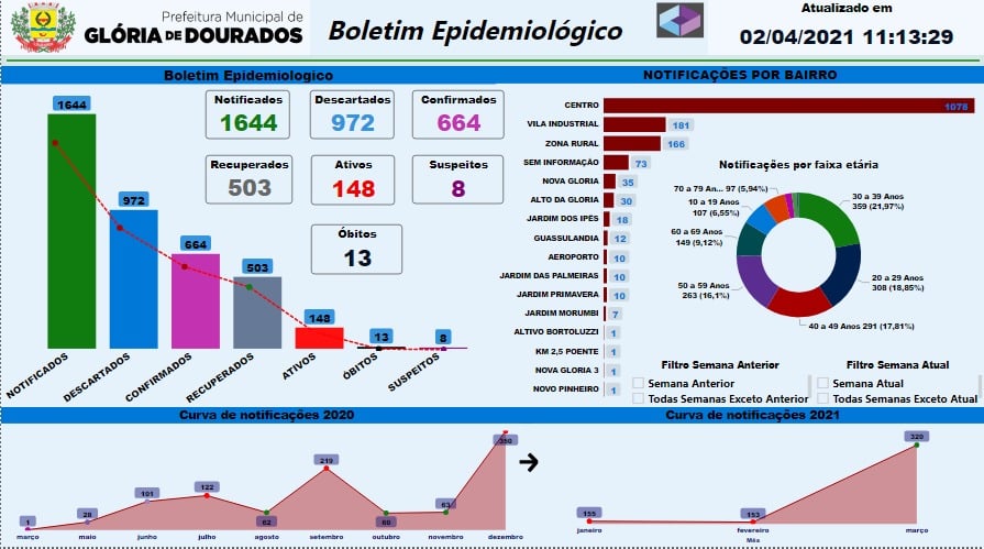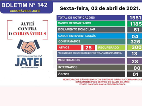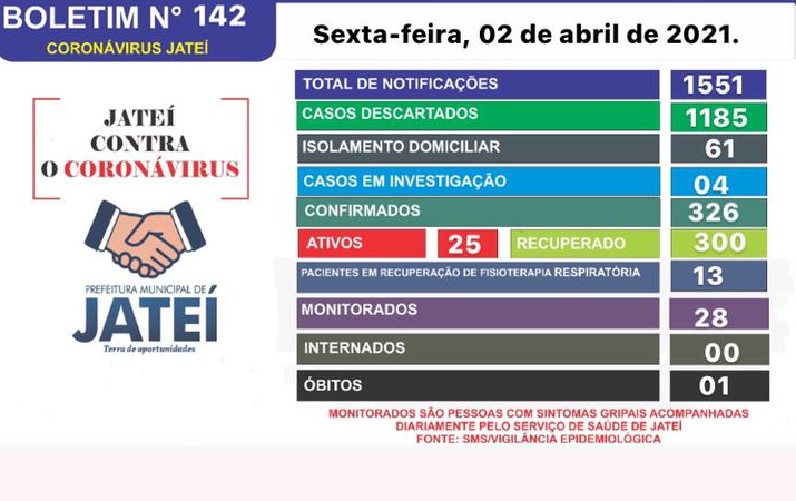 A Secretaria de Saúde municipal de Jateí, por meio da vigilância epidemiológica divulga boletim do dia 02 de Abril de 2021.