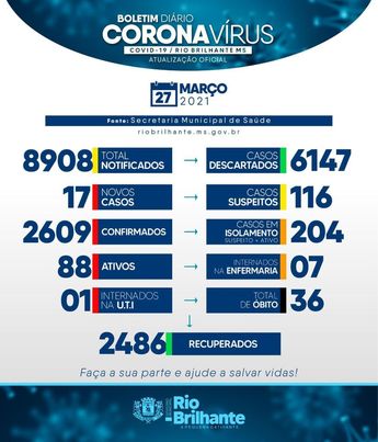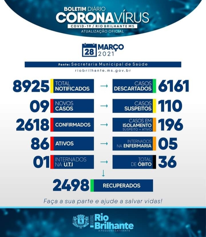 Regiaonline Boletim Epidemiológico: Em Rio Brilhante,17 novos casos de Sars-Cov-2 e ativos chegam a 88.