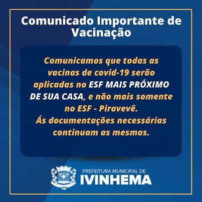 Regiaonline Comunicado: Prefeitura Municipal de Ivinhema muda Tática na vacinação contra Covid-19, para facilitar para a população, e diversifica locais para imunização.
