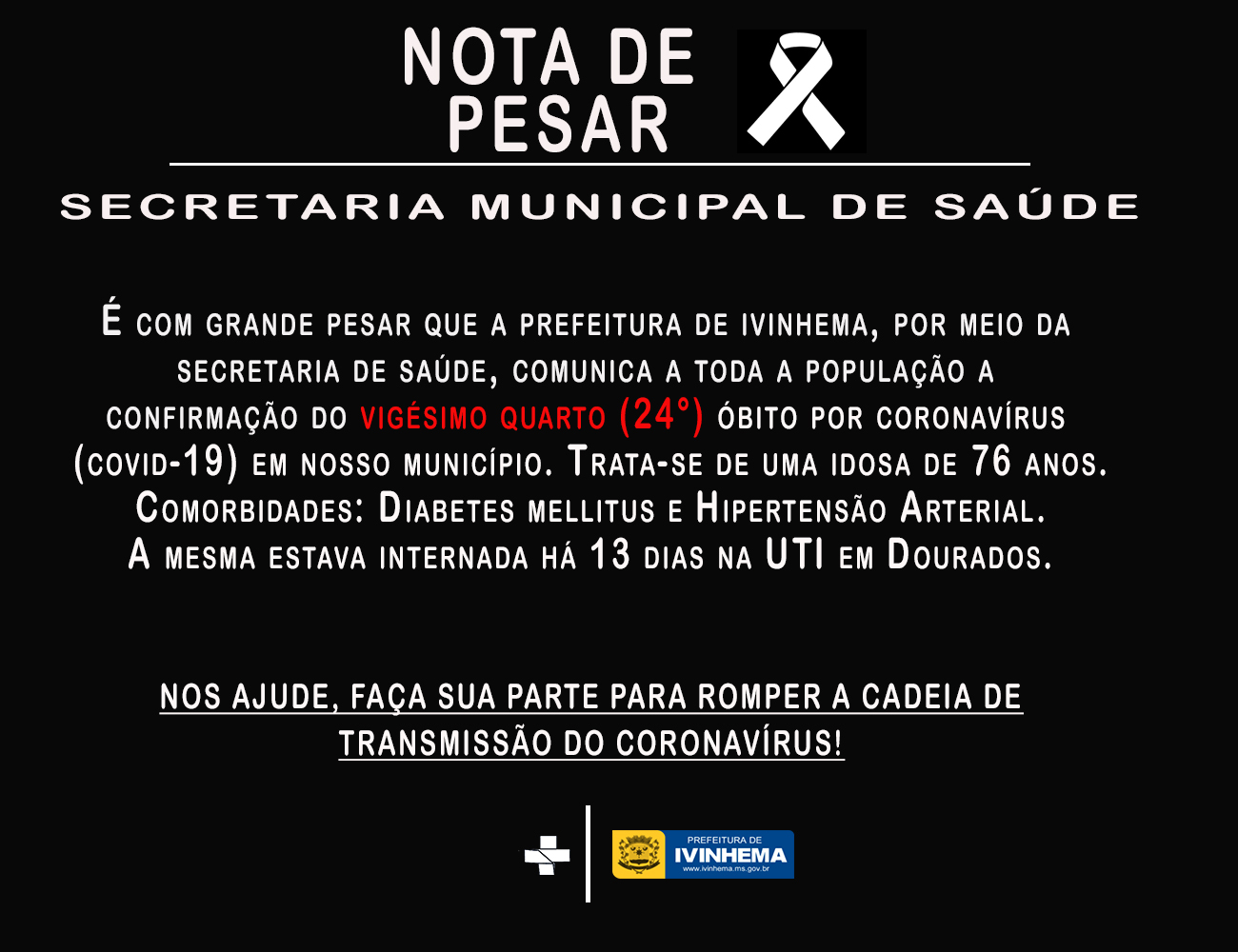 IVINHEMA CONFIRMA O 24° ÓBITO POR CORONAVÍRUS