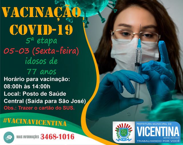 Regiaonline Imunização: Vicentina dá sequência a 5ª etapa da Vacinação Covid-19 nesta sexta-feira.