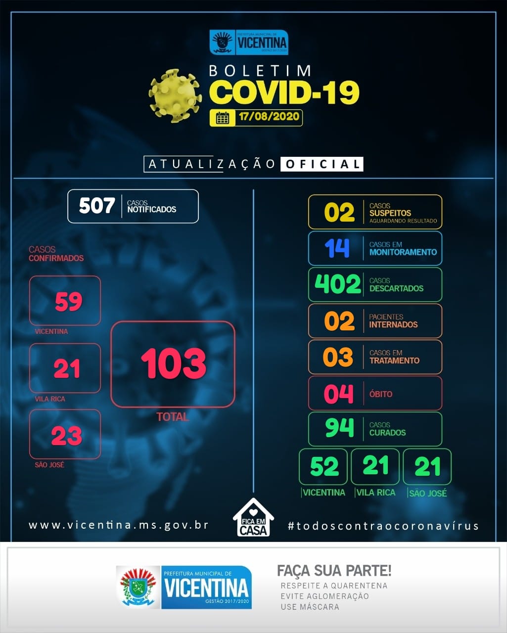 Regiaonline Coronavírus: Vicentina tem mais 02 casos confirmados e chega a 103 no total.