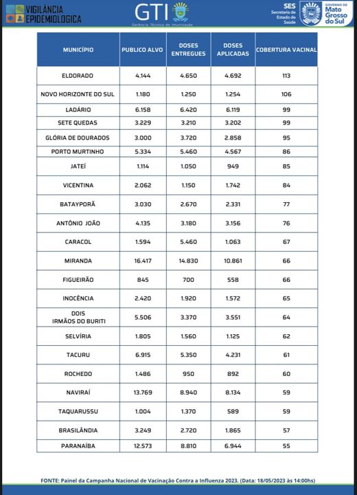 Glória de Dourados está em 5° lugar no ranking do Boletim da Campanha de Vacinação Contra INFLUENZA.