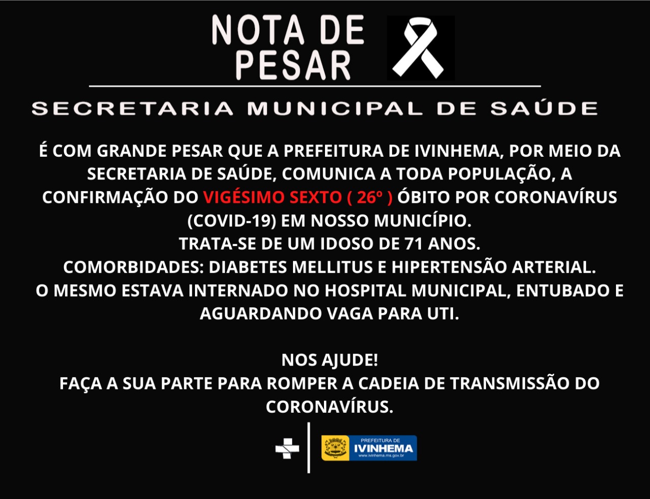 Regiaonline Luto em Ivinhema: Município chega ao 26º óbito por Coronavírus.